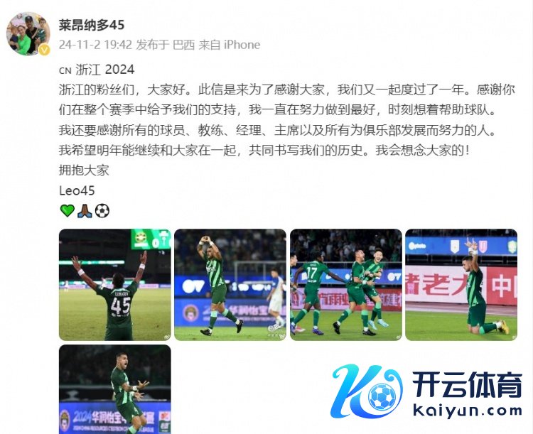 11月2日讯 2024赛季中超联赛战罢,浙江队赢得11胜5平14负的战绩名顺序七。浙江队外助莱昂纳多更新了个东说念主酬酢媒体。
