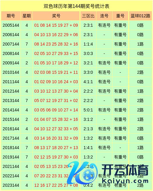 红球重号:在第144期历史同时开奖中,有15期奖号包含了重号,重号出现比例为83.33%,本年同时瞻望出现1个客岁第144期红球重号,参考重号33。